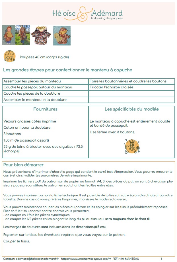 Si vous optez pour le téléchargement, vous recevrez les liens de téléchargement avec la confirmation de commande (soit aussitôt après la validation du paiement). Il faudra imprimer au minimum les pages du patron sur format A4. Les patrons sont à taille réelle, vous n’avez pas besoin de les redimensionner. L’une des pages de patron contient un carré test d’impression (2 x 2 cm) qui permet de vérifier les paramètres de votre imprimante. Vous pouvez imprimer les fiches techniques ou bien les lire sur un écran (au minimum une tablette).