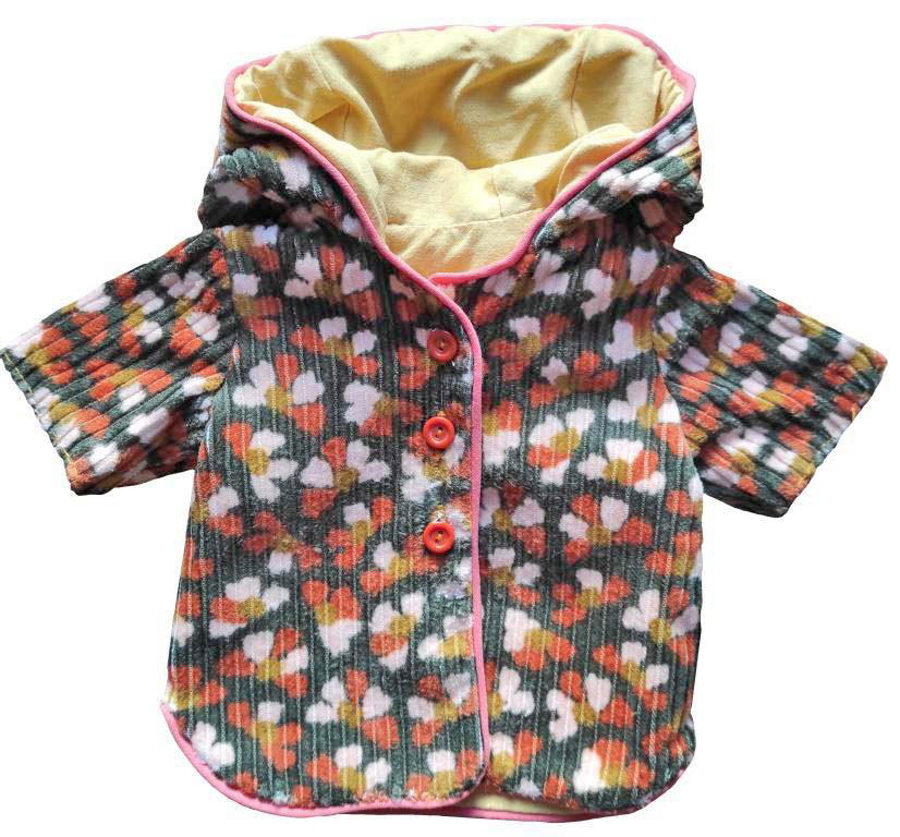 Le manteau à capuche de la poupée de 40 cm (Marie-Françoise) est entièrement doublé. Il est entièrement bordé de passepoil, ce qui fait son charme. Le manteau se ferme devant à l’aide de 3 boutons/boutonnières.