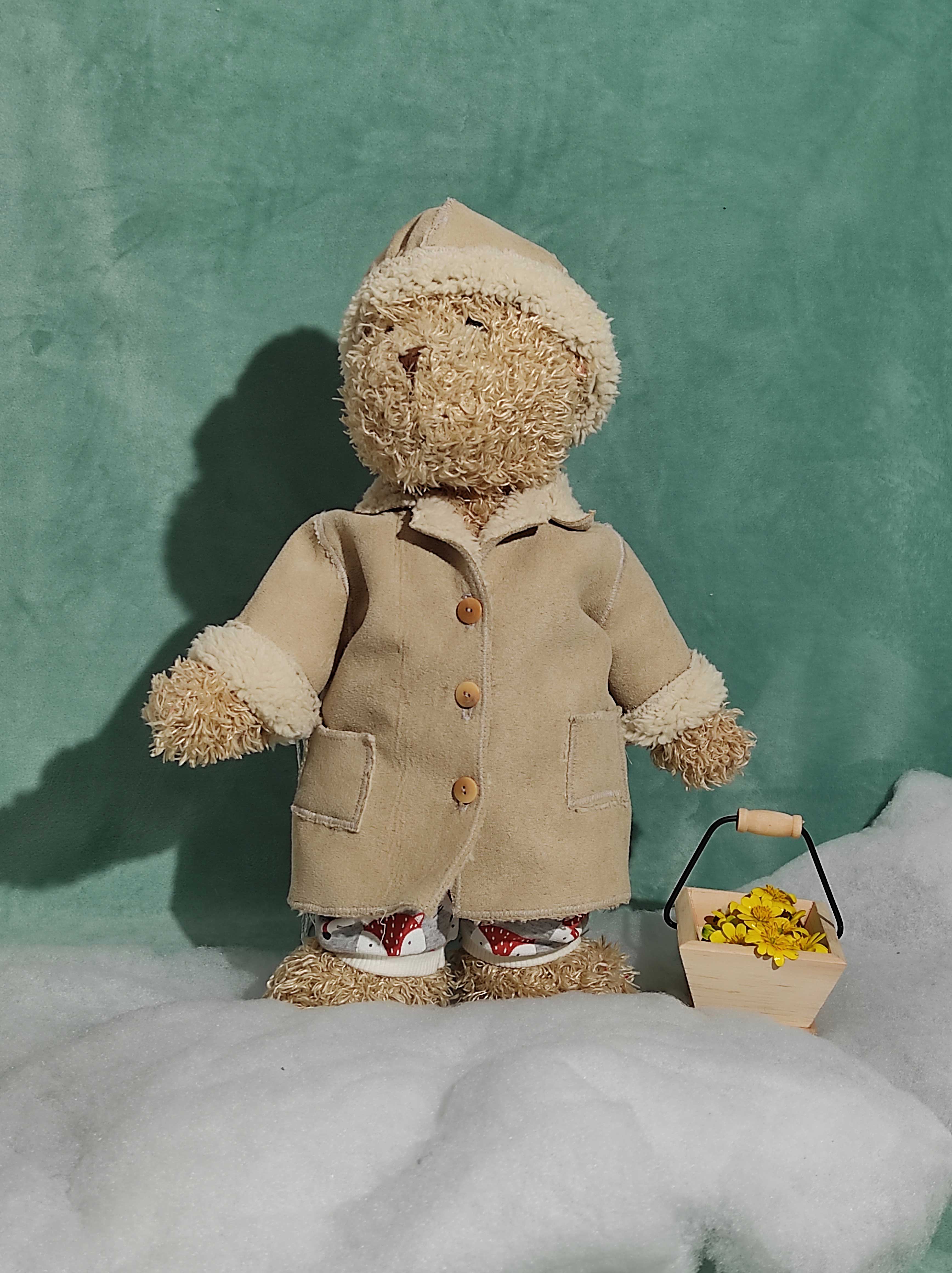 Ce manteau en tissu fausse peau de mouton retournée et le chapeau assorti va à 2 poupons, 2 poupées et à l’ours en peluche: la poupée de 36 cm (corps souple), la poupée de 40 cm (Marie-Françoise), les 2 poupons de 36 cm et l’ours en peluche.