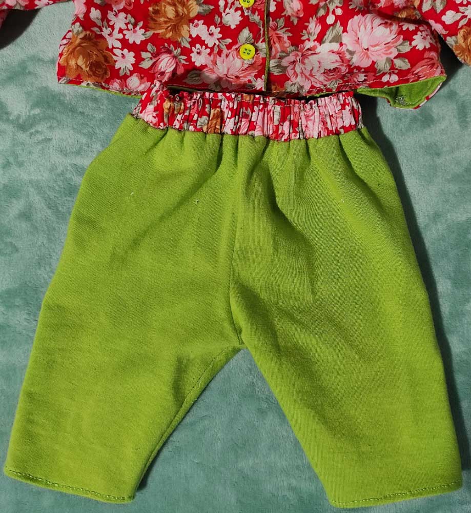 Les vêtements du poupon de 42 cm peuvent être réalisés entièrement à la machine (sauf éventuellement l’ourlet du bas des manches). Vous allez aimer associer les deux types de tissus et les faire se répondre entre la veste et le pantalon. La ceinture du pantalon est froncée préalablement à l’assemblage avec les jambes, cela la donne du peps au pantalon.