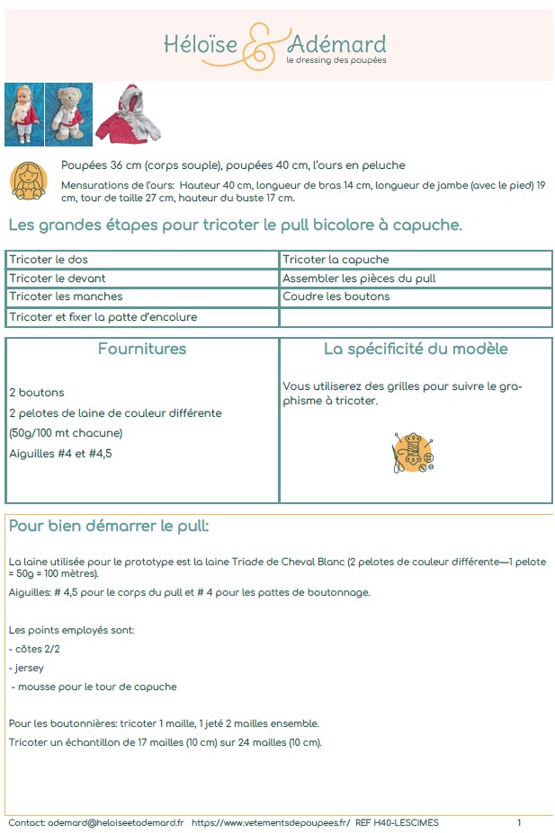 Ce pull a capuche pour Marie-Françoise, la poupée de 40 cm et pour l’ours en peluche est tricoté de 2 couleurs (diagrammes fournis). Il se porte sur un pantalon un peu large ou un jogging.
