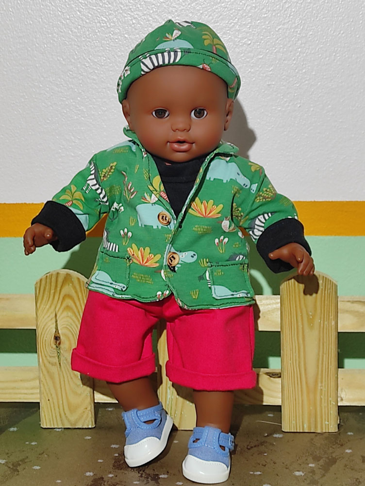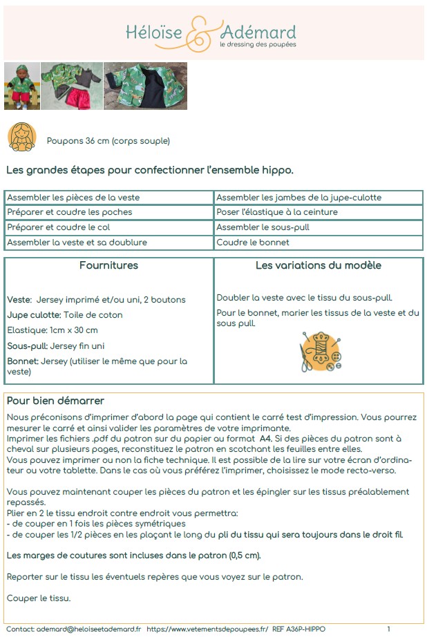 Vous allez adorer cet ensemble à coudre pour le poupon de 36 cm, corps souple. Il se compose d’une veste, une jupe-culotte, un sous-pull et un bonnet. Il s’appelle Hippo en référence à l’imprimé animal que nous avons choisi.