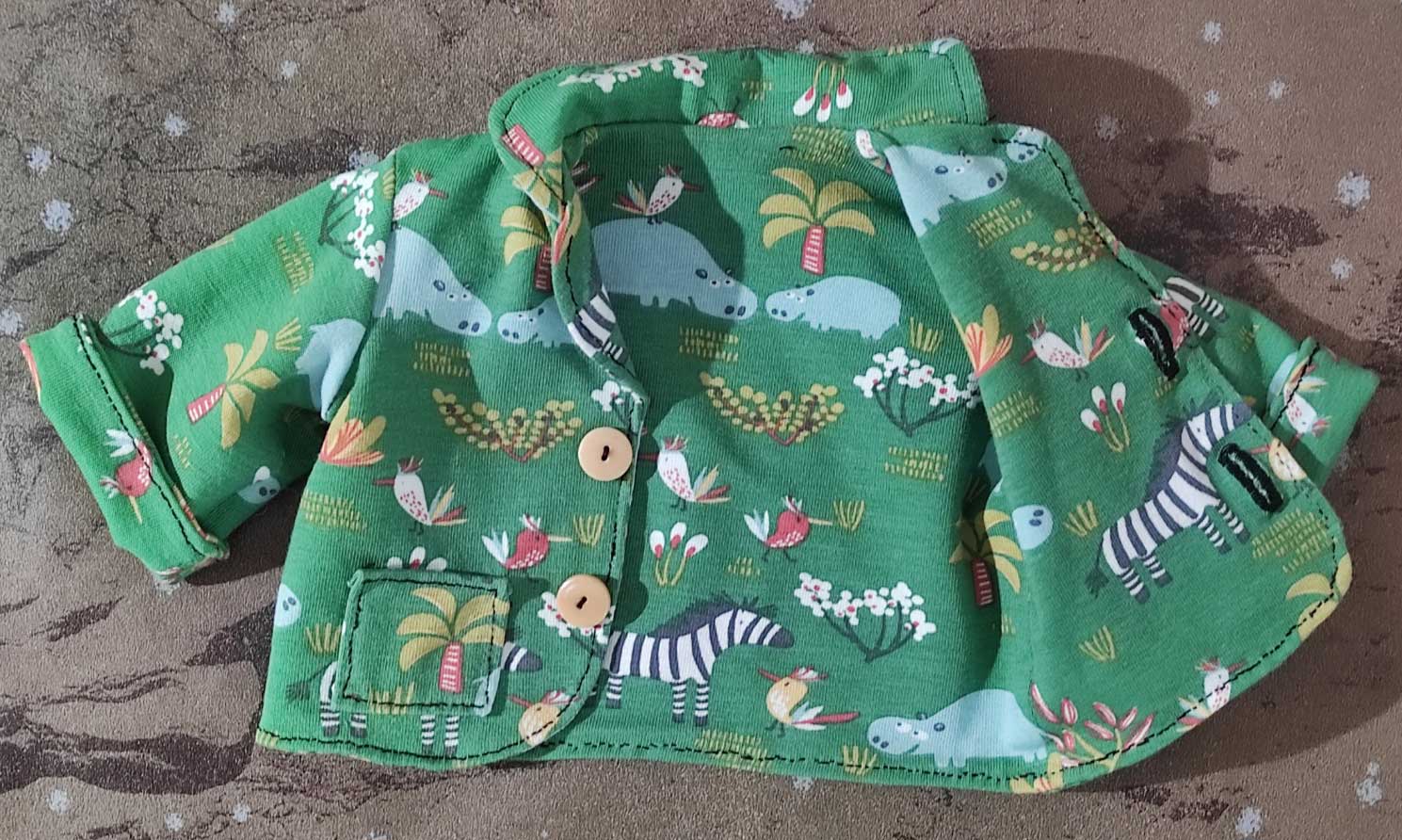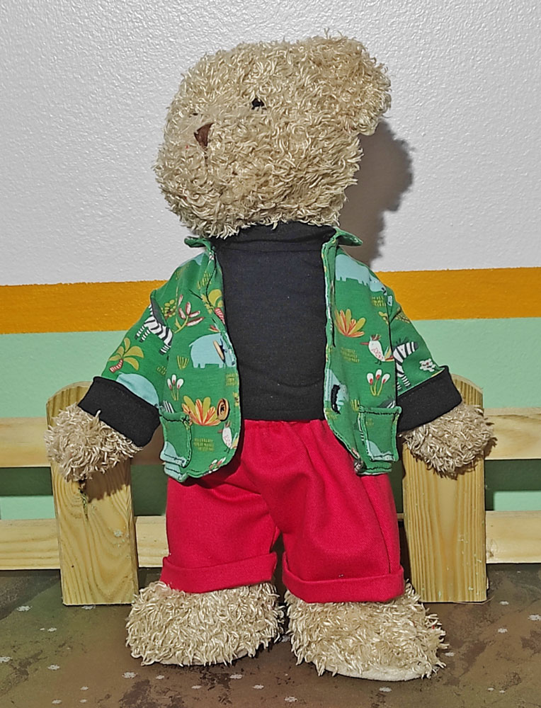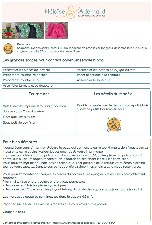 Vous allez adorer cet ensemble à coudre pour l’ours en peluche. Il se compose d’une veste, une jupe-culotte, un sous-pull. Il s’appelle Hippo en référence à l’imprimé animal que nous avons choisi. Unis ou imprimés, faites vos choix de tissus.