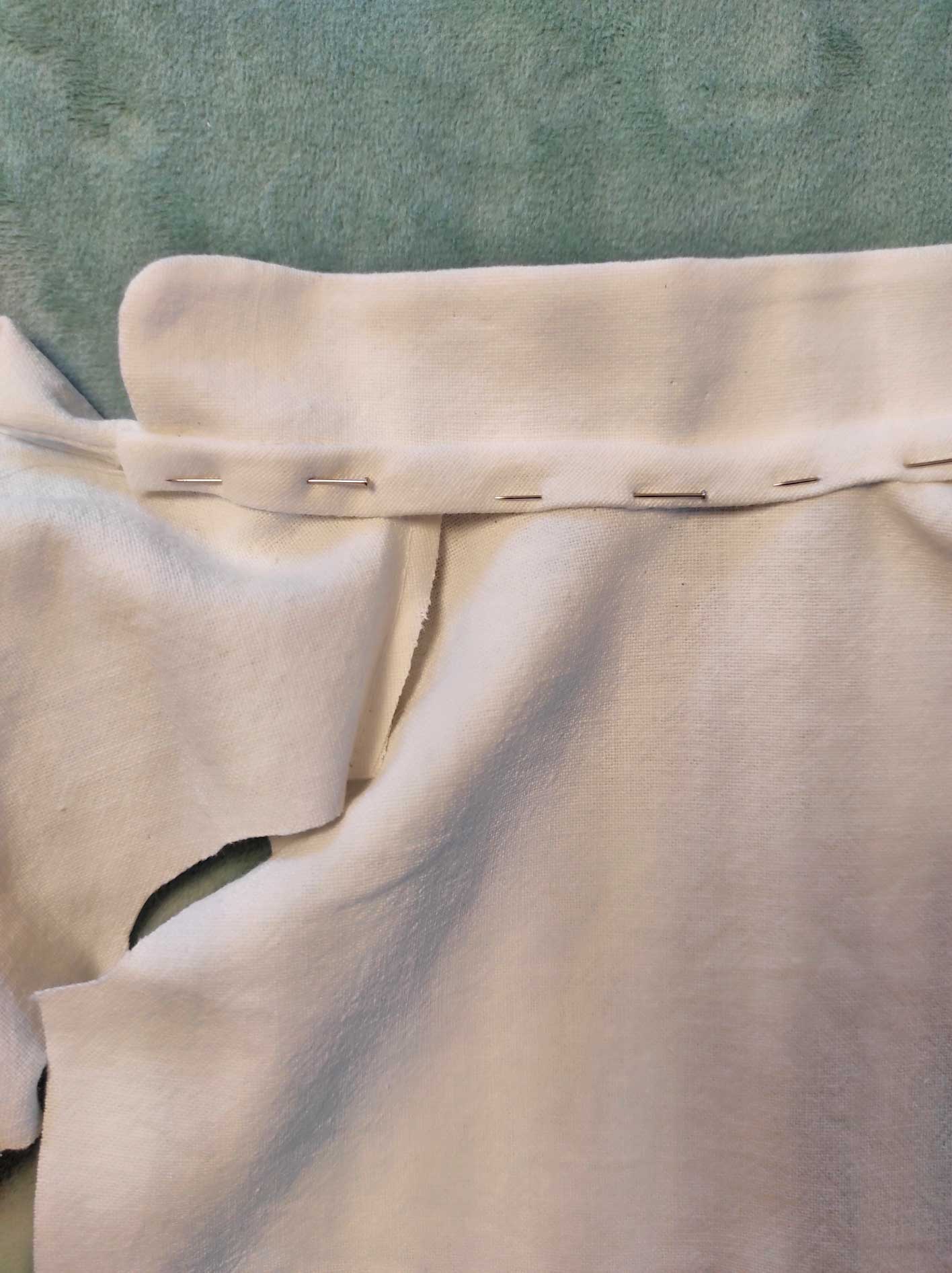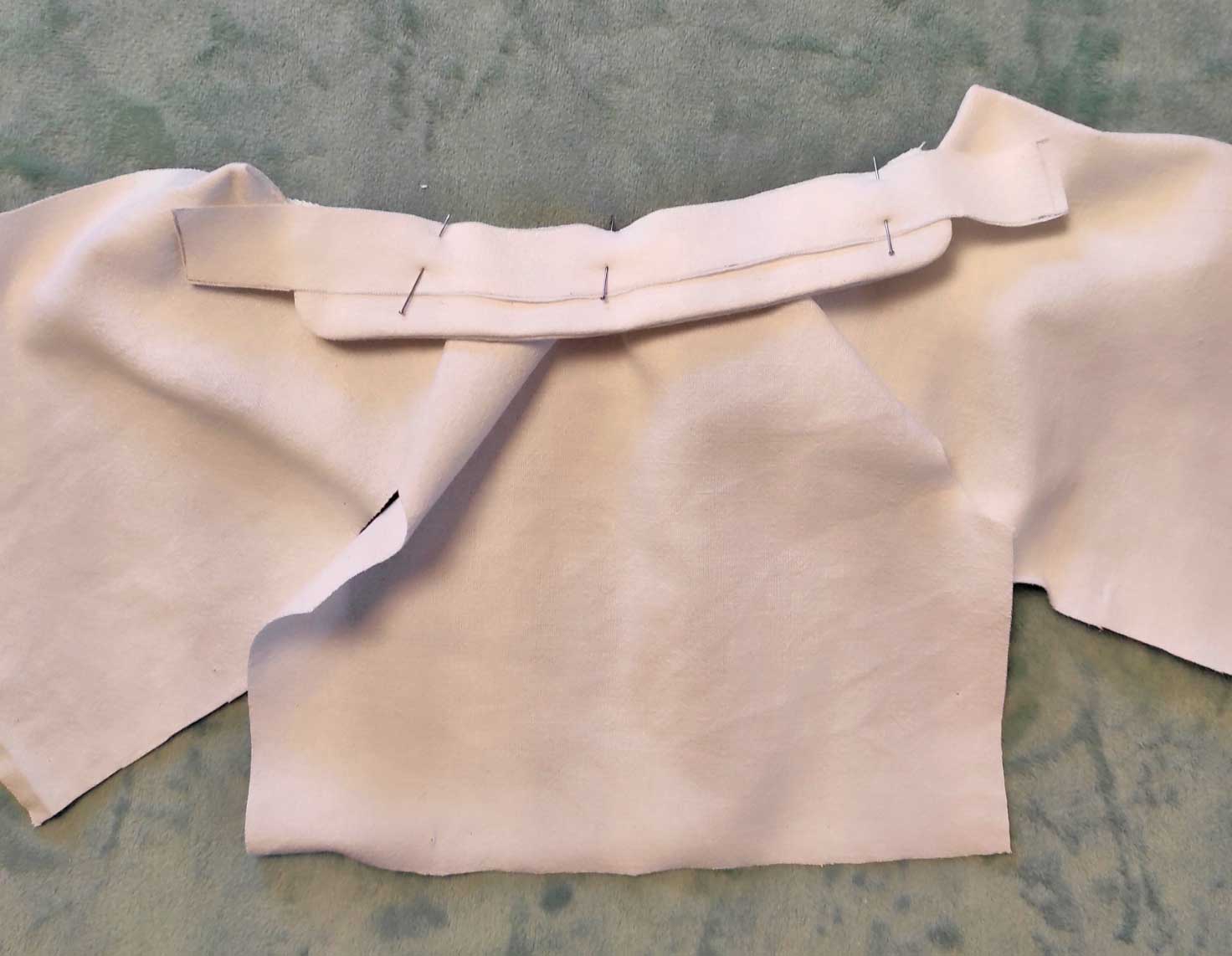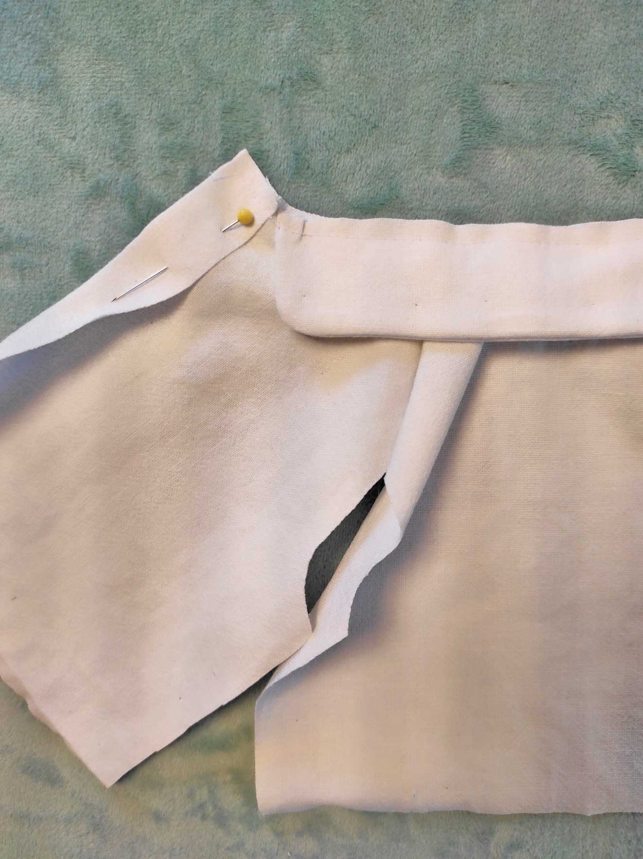 Endroit contre endroit replier chaque devant jusqu’aux extrémités du col. repasser. Maintenir par une épingle.