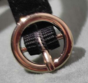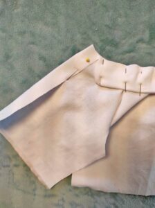Le biais a été coupé à 45° dans le tissu. Dans notre article « poser du biais sur un col« , nous expliquons comment couper son biais. Son rôle est de dissimuler la couture entre le col et l’encolure du vêtement de poupée.